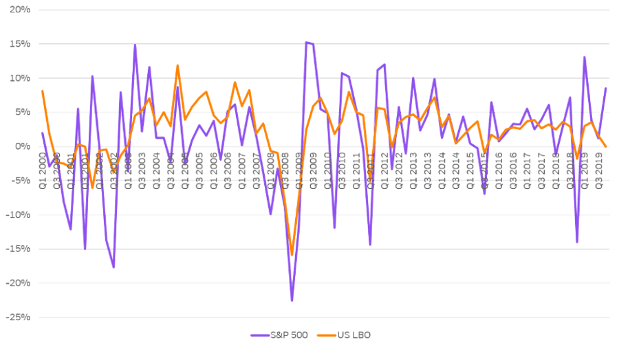 Figure 1: Historical quarterly returns of S&P500 and the NAV of US LBO funds