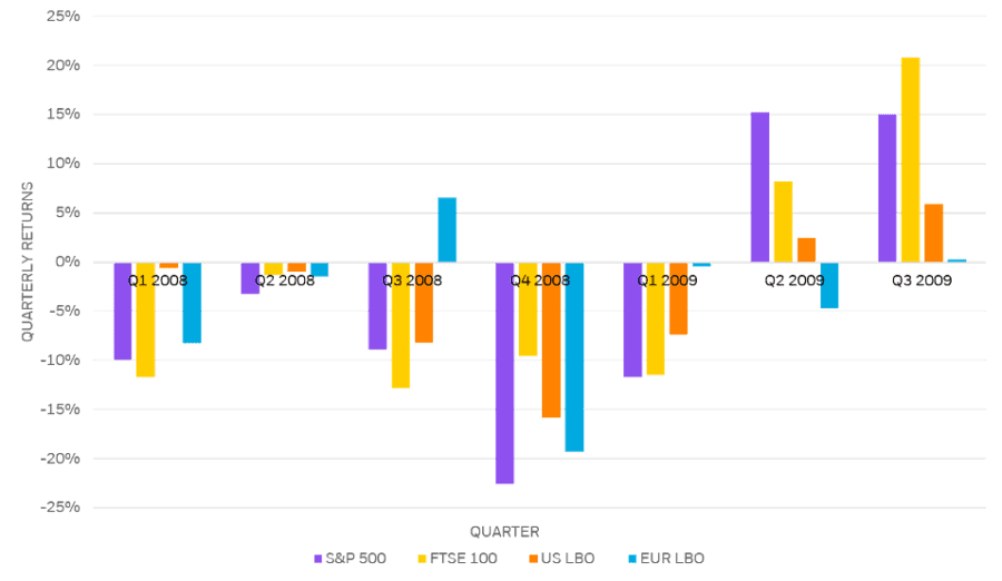 A close look at the private market returns shows that US and European LBO funds exhibited strong resilience in the early 2000s, with US LBO market declining by less than 13%. Figure 2 illustrates the under-reaction of the US and European NAVs relative to the evolution of public indexes during the global financial crisis. The S&P 500 suffered a quarterly drop of 23% in Q4 2008, followed by another massive loss in value in the subsequent quarter. However, LBO funds showed more stable evolution by recording lower losses during those quarters, but also by exhibiting relatively lower recovery rates during Q2 and Q3 in 2009, relative to S&P 500.