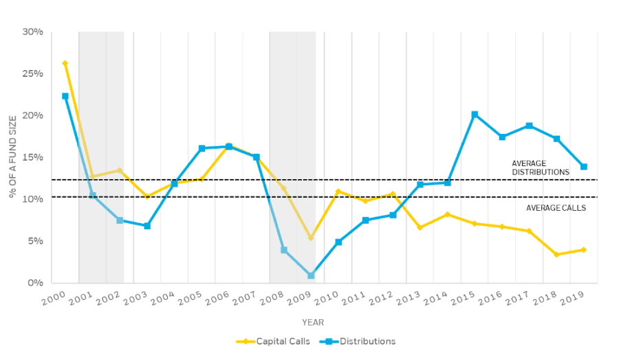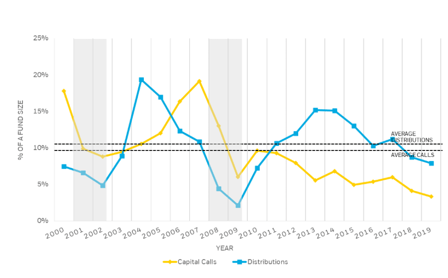 - During the early 2000s recession and global financial crisis, meanwhile, capital calls never dropped below 5%, indicating that private equity funds are able to keep investing even during the depths of an economic downturn.