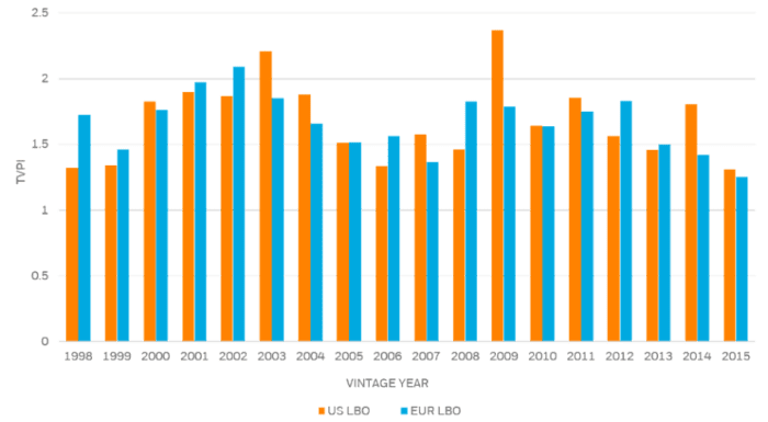 Figure 5: Historical performance of US and European LBO funds of different vintage years