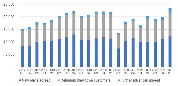 - Q1 2022 saw 9,450 existing customers with drawdown lifetime mortgages return to withdraw funds from their agreed reserves. This was up from 7,571 in Q4 2021 and 5,566 in Q1 2021 but remains below the pre-pandemic peak of 9,805 in Q1 2020 with this area of the market having been the most subdued in the last two years.