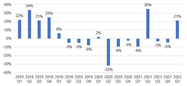 Graph 2: Annual change in the number of new equity release plans agreed, Q1 2018 to Q1 2022