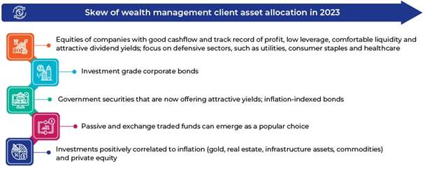 Capital markets are currently highly volatile as the global economy faces an imminent recession. Inflationary pressure, a high-interest-rate environment, uncertainties around the Russia-Ukraine conflict and the energy crisis in Europe would continue to affect capital markets in 2023, although to a lesser extent than in 2022. Market volatility would call for focus on investments in resilient equities and fixed income instruments, which could provide some downside protection. Furthermore, inflation levels are likely to remain structurally high in the near term, despite an anticipated moderation in consumer prices amid easing supply-chain concerns and a softening of prices of a few commodities. Therefore, the prime focus of wealth managers in the near term would be on advising clients on an effective inflation hedge.